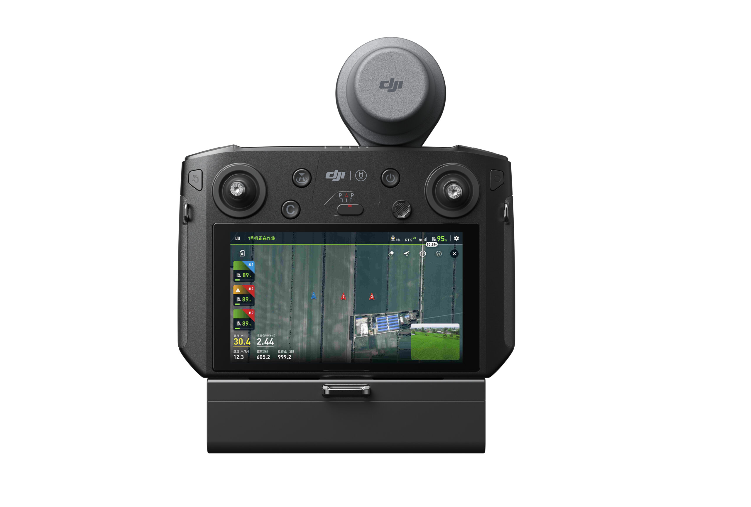 Az új távirányító stabil élőkép átvitelt biztosít, akár 5 kilométeres távolságból, amely 67%-os teljesítmény növekedést jelent az előző generációkhoz képest. A nagy fényerejű 5.5 inches érintő kijelzője még intenzív napsütés mellett is kiválóan olvasható. A megnövelt hatékonyság érdekében az Agras T30 intelligens távirányítója képes egyidejűleg több drón biztonságos munkavégzését koordinálni. A további fejlesztések közt megtalálható az intenzívebb interferencia szűrés, a megnövelt jelerősség és a magas precizitású RTK vevőegység.